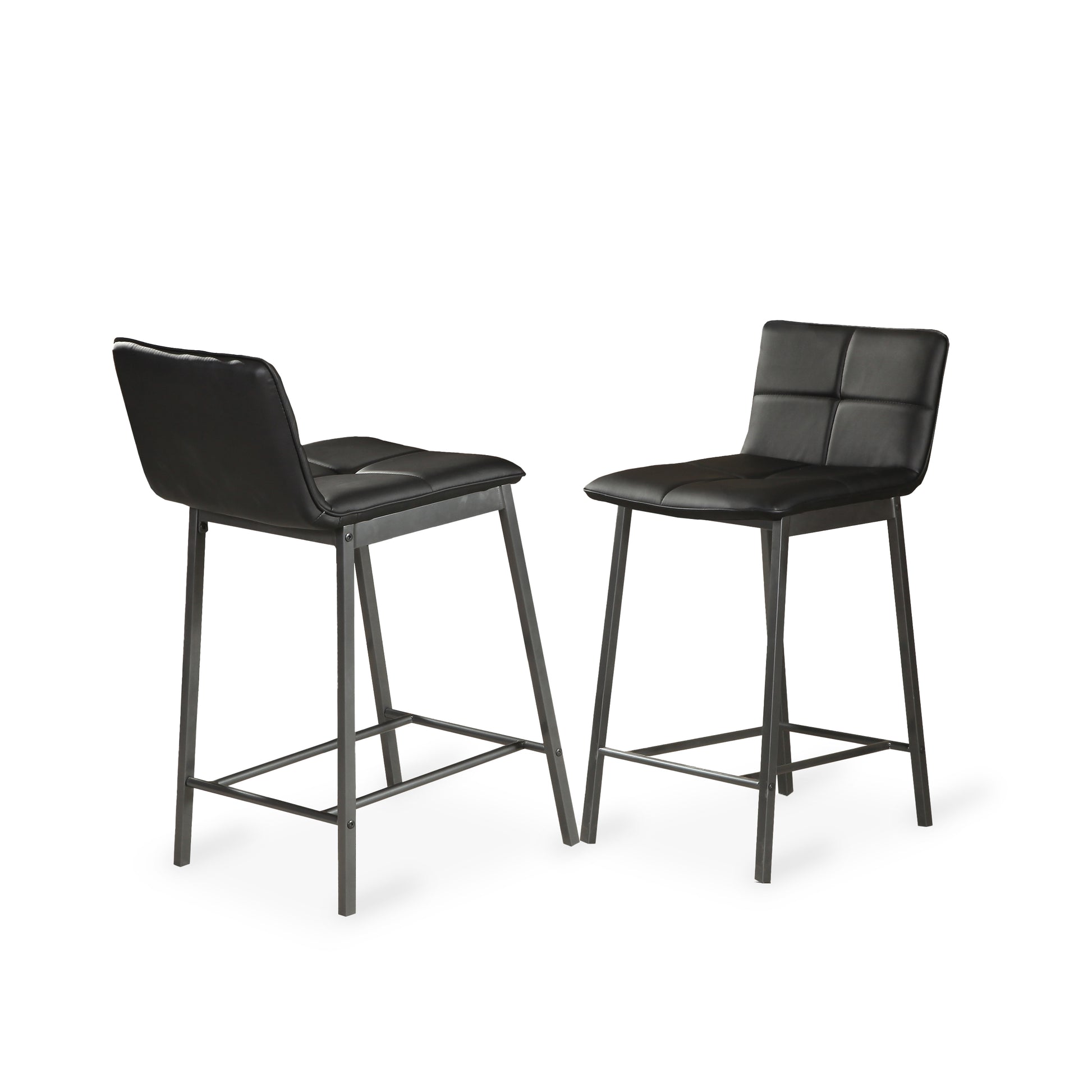 The black leatherette pub chairs, with charcoal metal finish include lowered backs and are light weight. Chairs come 4/box.