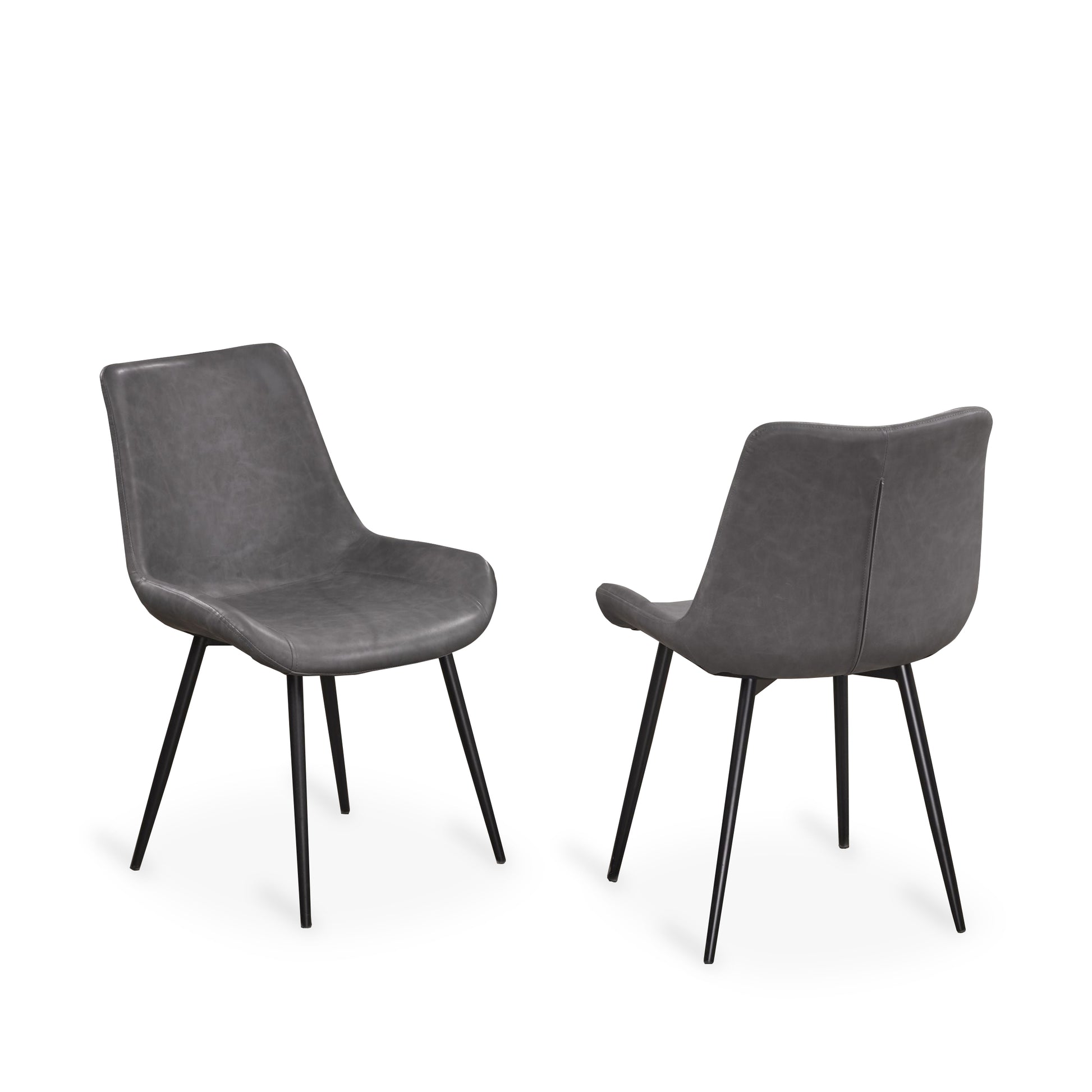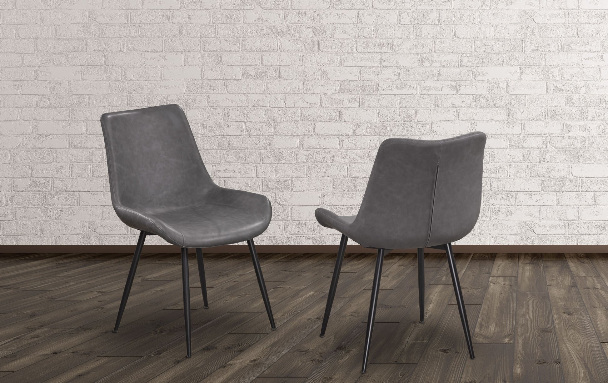 Give your dining area a boost of contemporary style with these stunning dining chairs. Chairs include large bucket seating area and are draped in soft, grey air suede fabric. 2 per box.